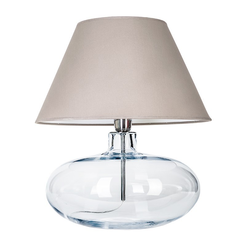 Lampa posiada zaokrągloną podstawę wykonaną z wysokiej jakości transparentnego szkła i szary abażur. Jej wysokość wynosi 44 centymetry, z czego wysokość podstawy to 22 centymetry.