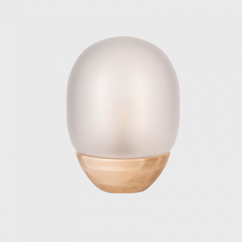 Klosz wykonany ręcznie ze szkła bezbarwnego a następnie malowany na biało farbą satynową. Podstawa wykonana z drewna bukowego.