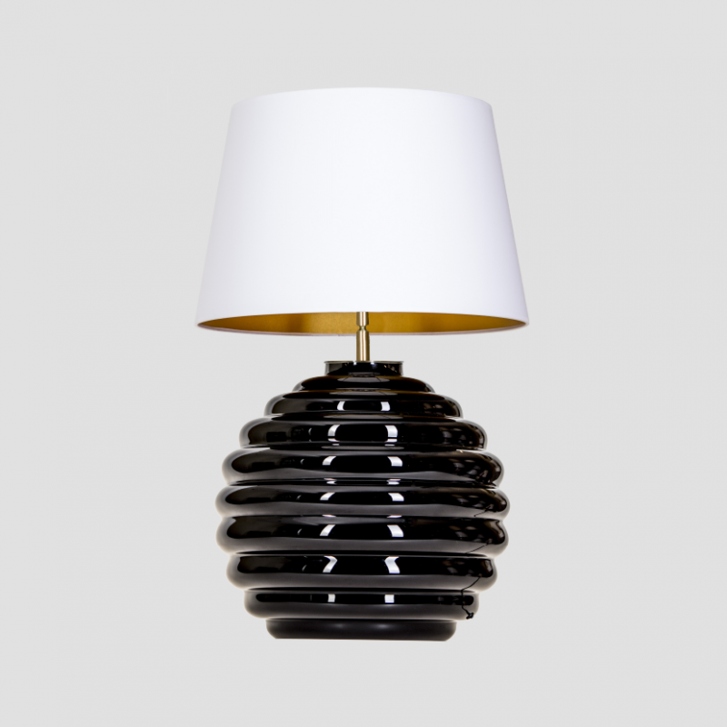 Podstawa lampy wykonana z bezbarwnego szkła, ręcznie formowanego, a następnie malowanego na kolor czarny.