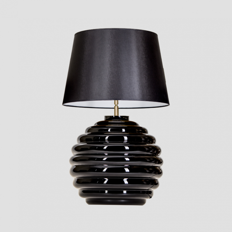 Podstawa lampy wykonana z bezbarwnego szkła, ręcznie formowanego, a następnie malowanego na kolor czarny.