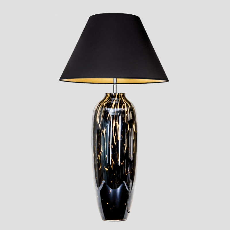 Podstawa lampy wykonana jest z ręcznie formowanego szkła, transparentnego i czarnego a następnie malowana farbą nadającą jej połysk macicy perłowej