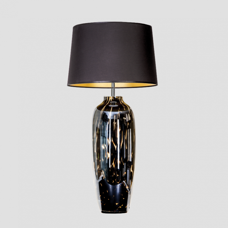 Szkło ręcznie formowane, barwione w masie szklanej, z połyskiem macicy perłowej. Niepowtarzalne rozmieszczenie i kształt czarnych plam sprawiają, że każdy egzemplarz lampy jest unikalny.