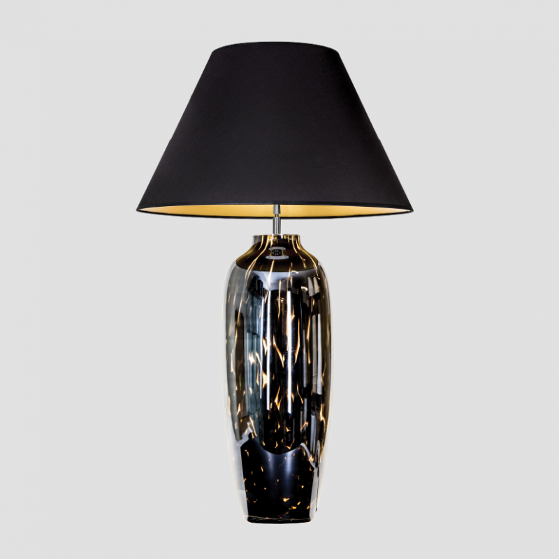 Szkło ręcznie formowane, barwione w masie szklanej, z połyskiem macicy perłowej. Niepowtarzalne rozmieszczenie i kształt czarnych plam sprawiają, że każdy egzemplarz lampy jest unikalny.
