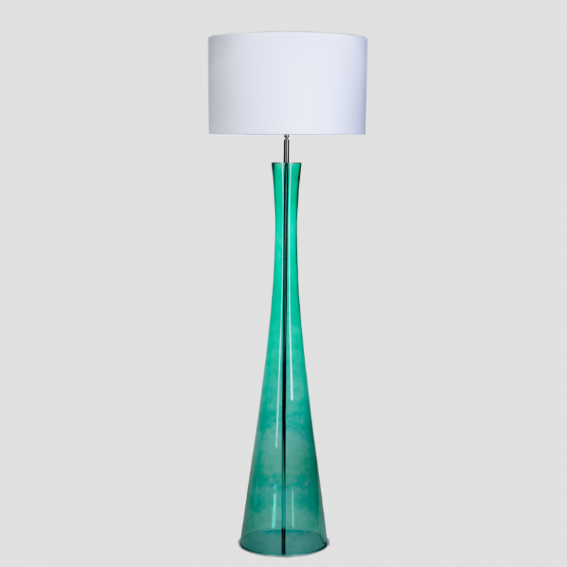 Podstawa lampy wykonana z bezbarwnego, ręcznie formowanego szkła, a następnie malowana transparentną, zieloną farbą.