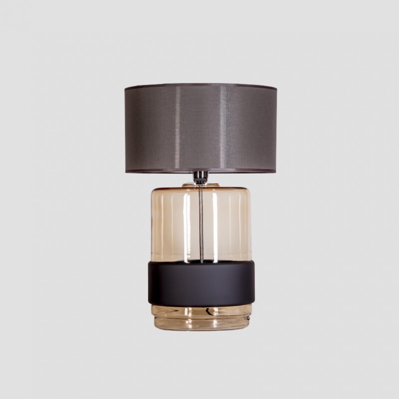 Podstawa lampy wykonana z bezbarwnego, ręcznie formowanego szkła, malowanego bursztynową, transparentną farbą. Pas malowany czarną matową farbą.