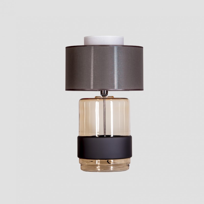 Podstawa lampy wykonana z bezbarwnego, ręcznie formowanego szkła, malowanego bursztynową, transparentną farbą. Pas malowany czarną matową farbą.