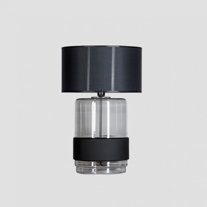 Podstawa lampy wykonana z bezbarwnego, ręcznie formowanego szkła, malowanego czarną, transparentną farbą. Pas malowany czarną matową farbą.