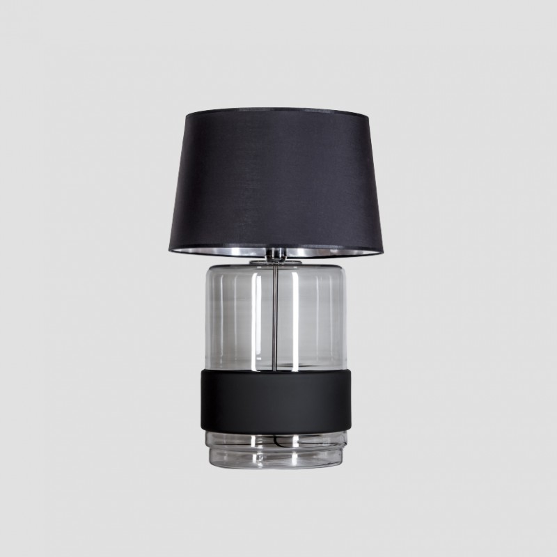 Podstawa lampy wykonana z bezbarwnego, ręcznie formowanego szkła, malowanego czarną, transparentną farbą. Pas malowany czarną matową farbą.