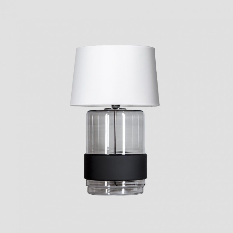 Podstawa lampy wykonana z bezbarwnego, ręcznie formowanego szkła, malowanego czarną, transparentną farbą. Pas malowany czarną matową farbą.