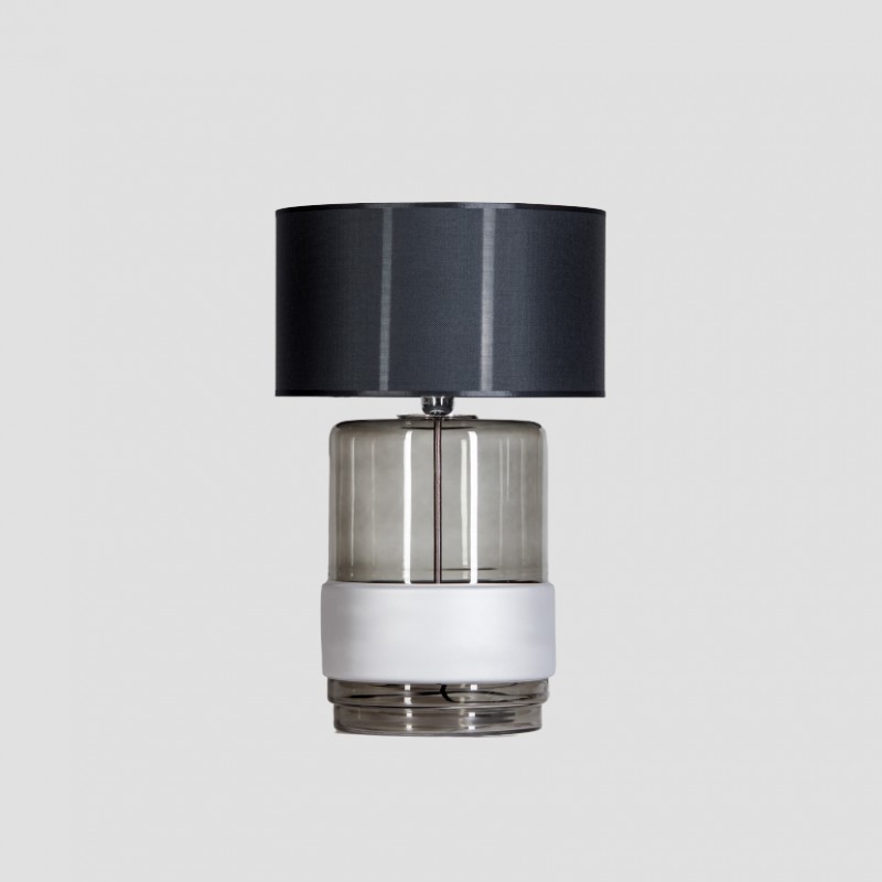 Podstawa lampy wykonana z bezbarwnego, ręcznie formowanego szkła, malowanego czarną, transparentną farbą. Pas malowany srebrną matową farbą.