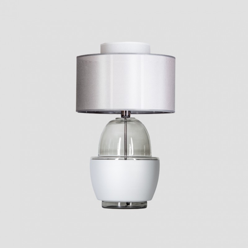 Podstawa lampy wykonana z bezbarwnego, ręcznie formowanego szkła, malowanego antracytową, transparentną farbą. Pas malowany srebrną matową farbą.