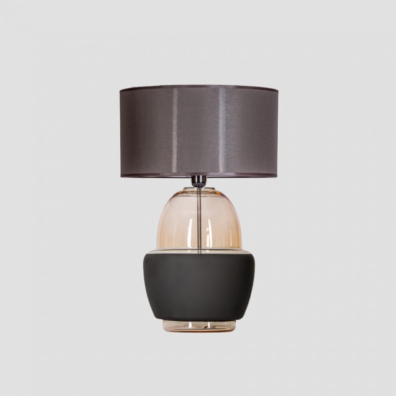 Podstawa lampy wykonana z bezbarwnego, ręcznie formowanego szkła, malowanego bursztynową, transparentną farbą. Pas malowany czarną matową farbą.