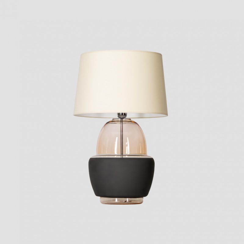 Podstawa lampy wykonana z bezbarwnego, ręcznie formowanego szkła, malowanego bursztynową, transparentną farbą. Pas malowany czarną matową farbą.