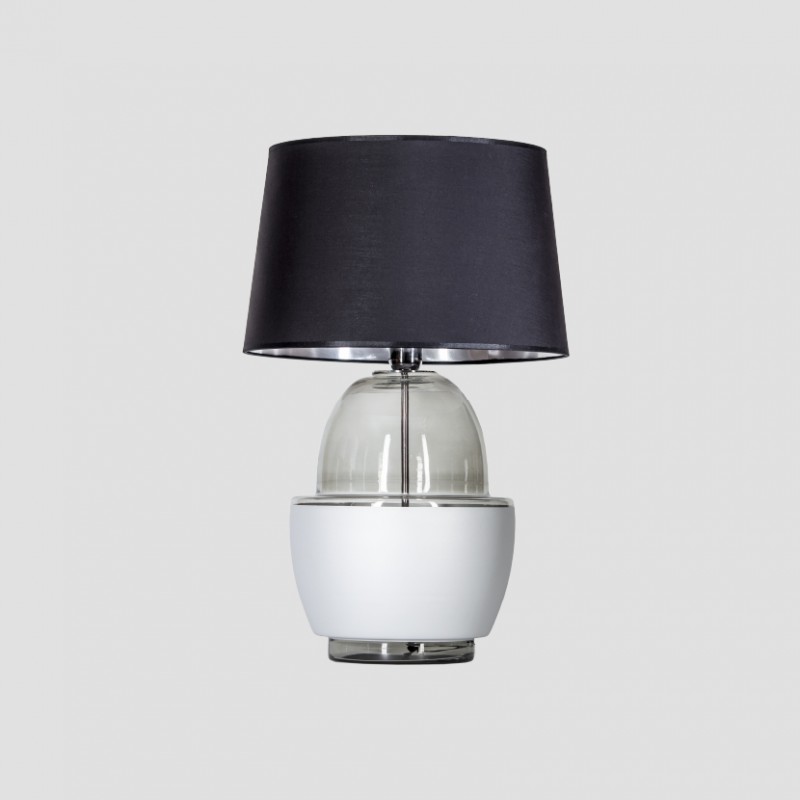 Podstawa lampy wykonana z bezbarwnego, ręcznie formowanego szkła, malowanego antracytową, transparentną farbą. Pas malowany srebrną matową farbą.