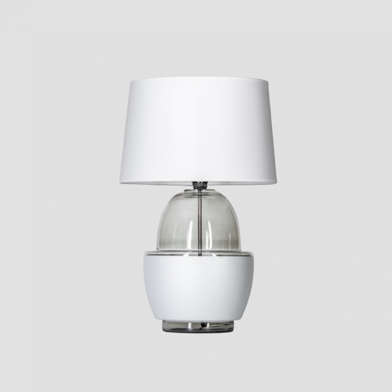 Podstawa lampy wykonana z bezbarwnego, ręcznie formowanego szkła, malowanego antracytową, transparentną farbą. Pas malowany srebrną matową farbą.
