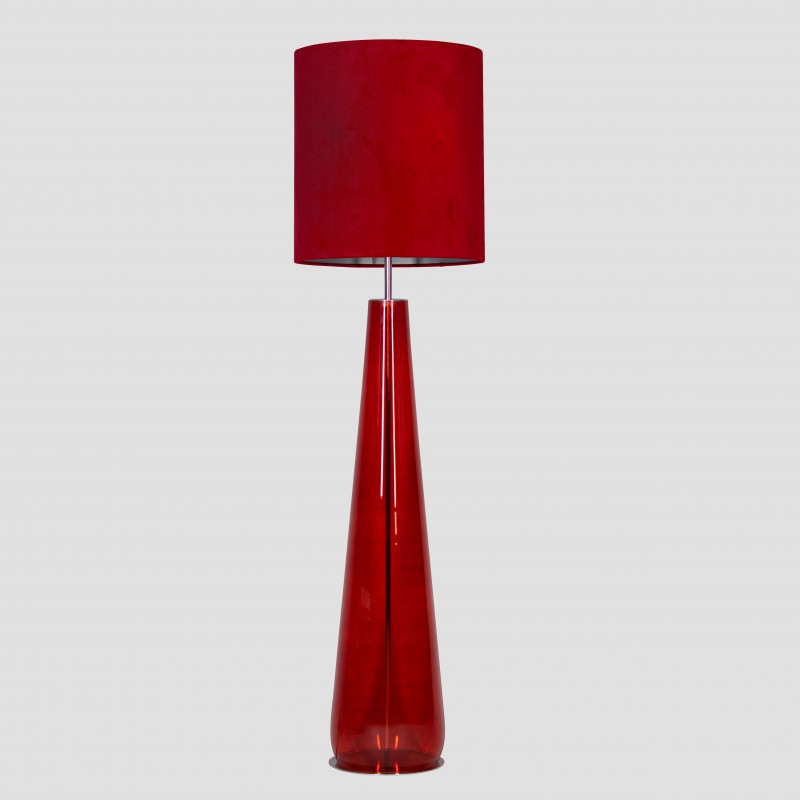 Lampa z ręcznie formowanego szkła bezbarwnego pokryta transparentną czerwoną powłoką. Osprzęt metalowy chromowany, kabel w czarnym oplocie, włącznik podłogowy. Zdjęcia mają charakter poglądowy – różnica między kolorem produktu na zdjęciach, a odcieniem produktu gotowego może wynikać z ustawień ekranu komputera czy monitora urządzeń mobilnych.