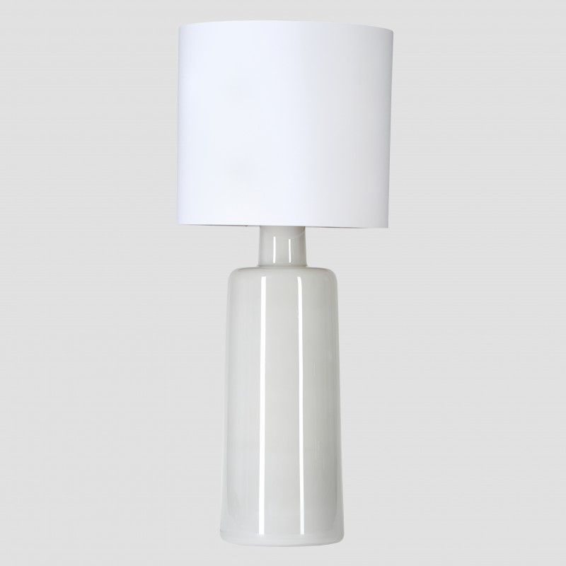 Lampa z ręcznie formowanego białego szkła pokryta błyszczącą jasnoszarą powłoką. Osprzęt metalowy w kolorze srebrnym, kabel z transparentnego pcv.