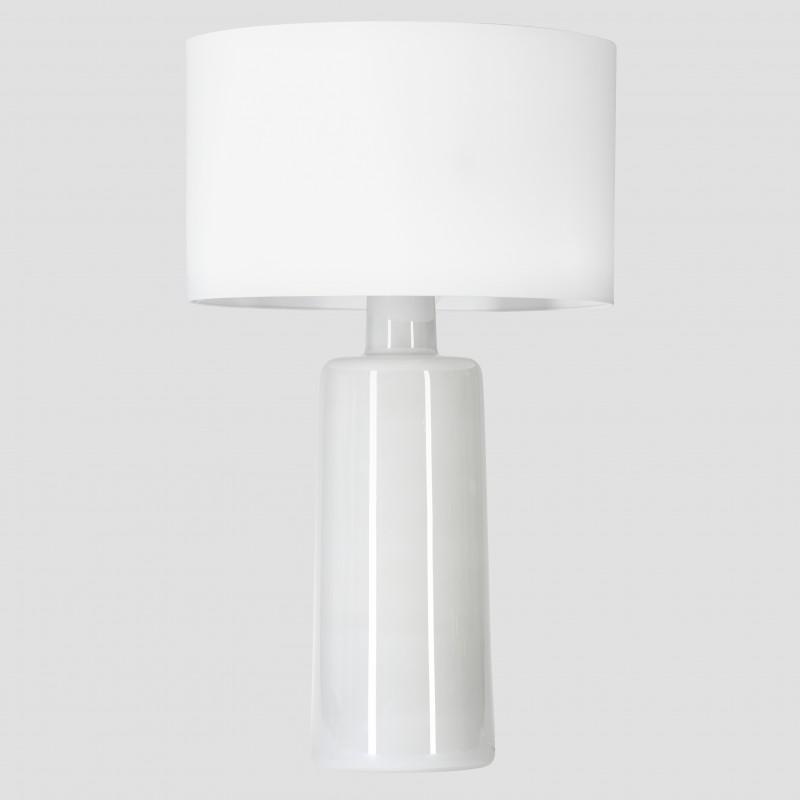 Lampa z ręcznie formowanego białego szkła pokryta błyszczącą jasnoszarą powłoką. Osprzęt metalowy w kolorze srebrnym, kabel z transparentnego pcv.