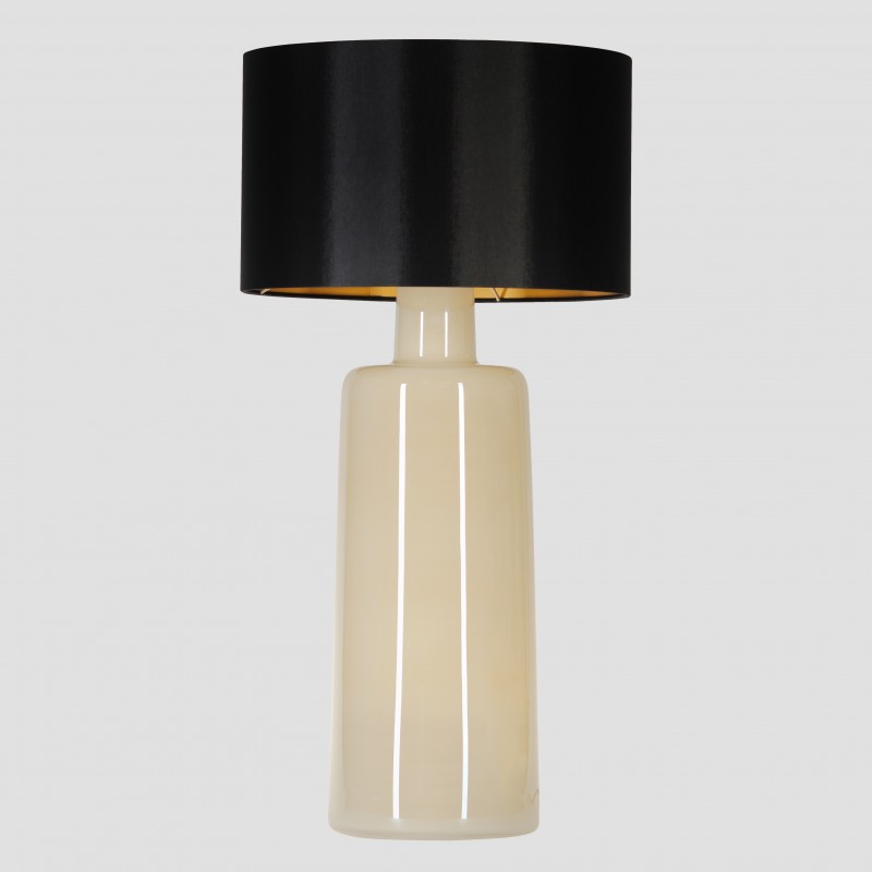 Lampa z ręcznie formowanego białego szkła pokryta błyszczącą waniliową powłoką. Osprzęt metalowy w kolorze złotym, kabel z transparentnego pcv.