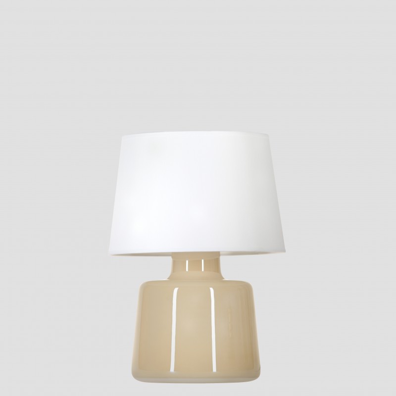 Lampa z ręcznie formowanego białego szkła pokryta błyszczącą waniliową powłoką. Osprzęt metalowy w kolorze złotym, kabel z transparentnego pcv.