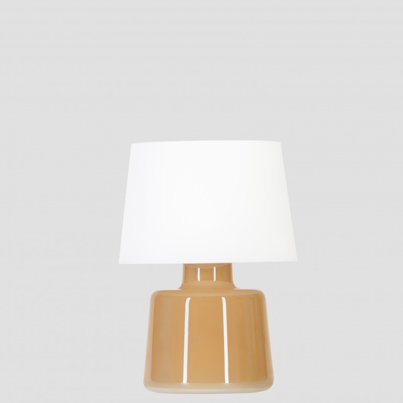 Lampa z ręcznie formowanego białego szkła pokryta błyszczącą bursztynową powłoką. Osprzęt metalowy w kolorze złotym, kabel z transparentnego pcv.