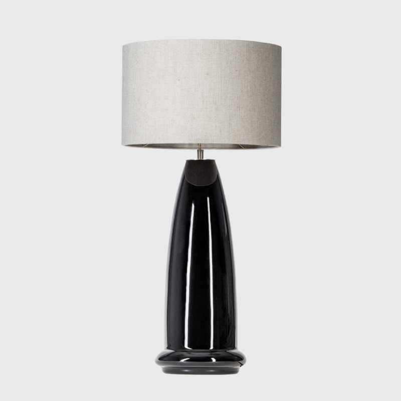 Lampa z ręcznie formowanego czarnego szkła. Osprzęt metalowy chromowany, kabel w czarnym oplocie tekstylnym, włącznik ręczny.