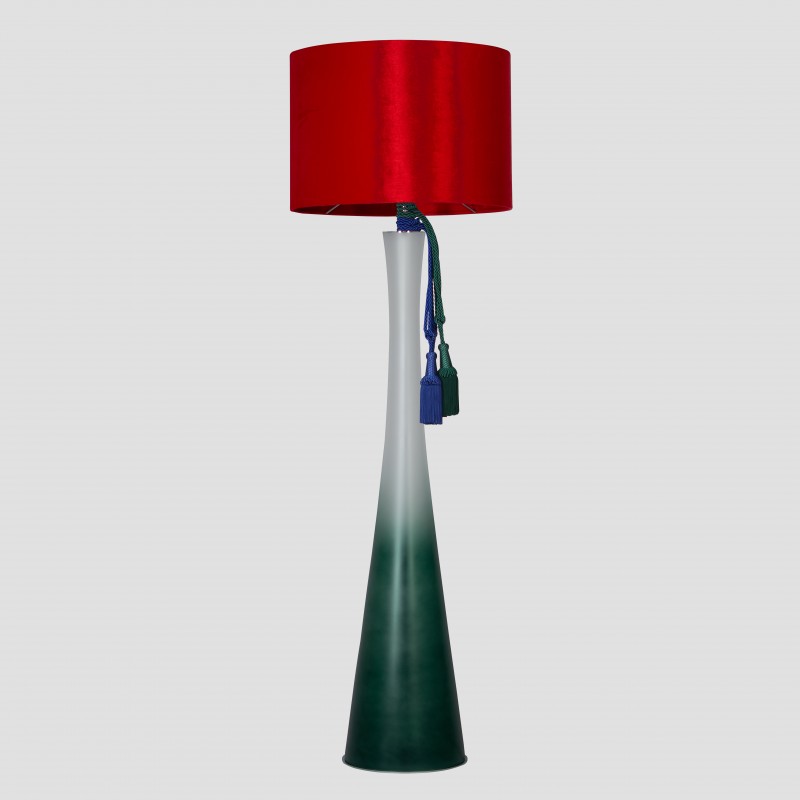 Lampa z ręcznie formowanego transparentnego szkła pokryta zieloną zanikajacą powłoką. Osprzęt metalowy chromowany, kabel w czarnym oplocie tekstylnym, włącznik podłogowy.