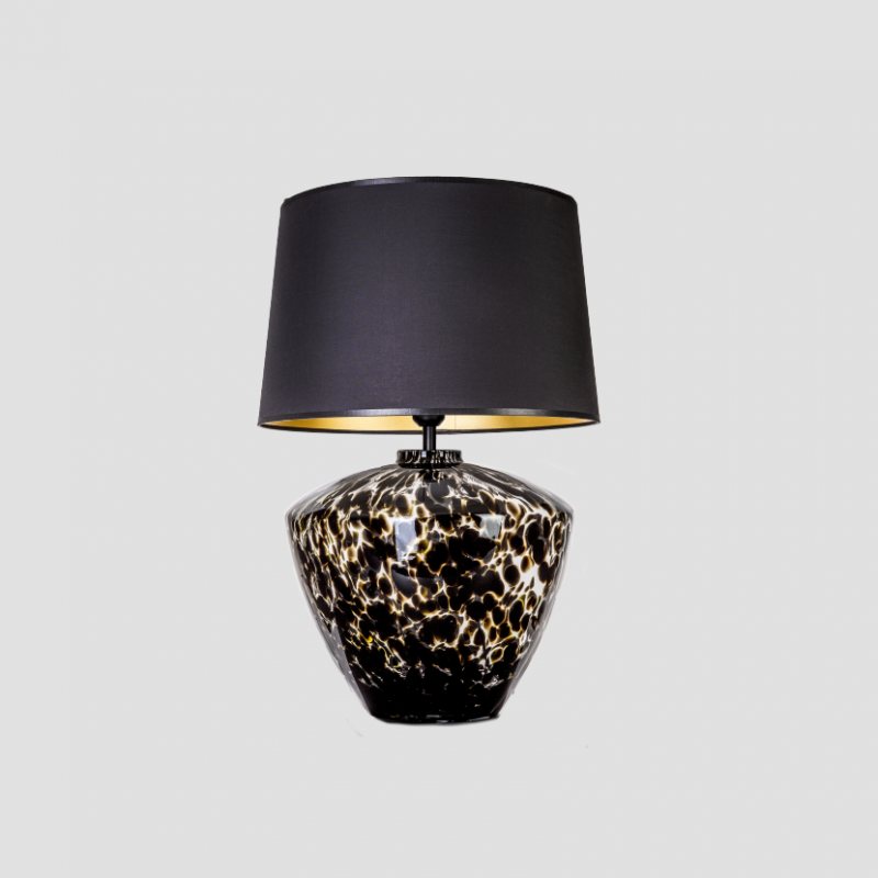 Podstawa lampy wykonana ze szkła ręcznie formowanego w kolorze czarnym i bezbarwnym.